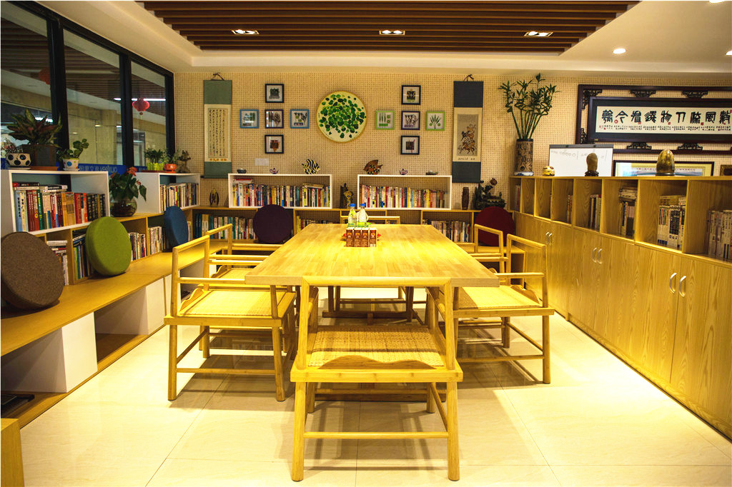 取水之藍(lán)、家之皇為元素,以木飾面、陶瓷、大理石為載體,應(yīng)用于墻面、地面、主背景墻。體現(xiàn)了甌文集團厚德載物,開放包容,儒雅熱情迎八方來客的氣魄。