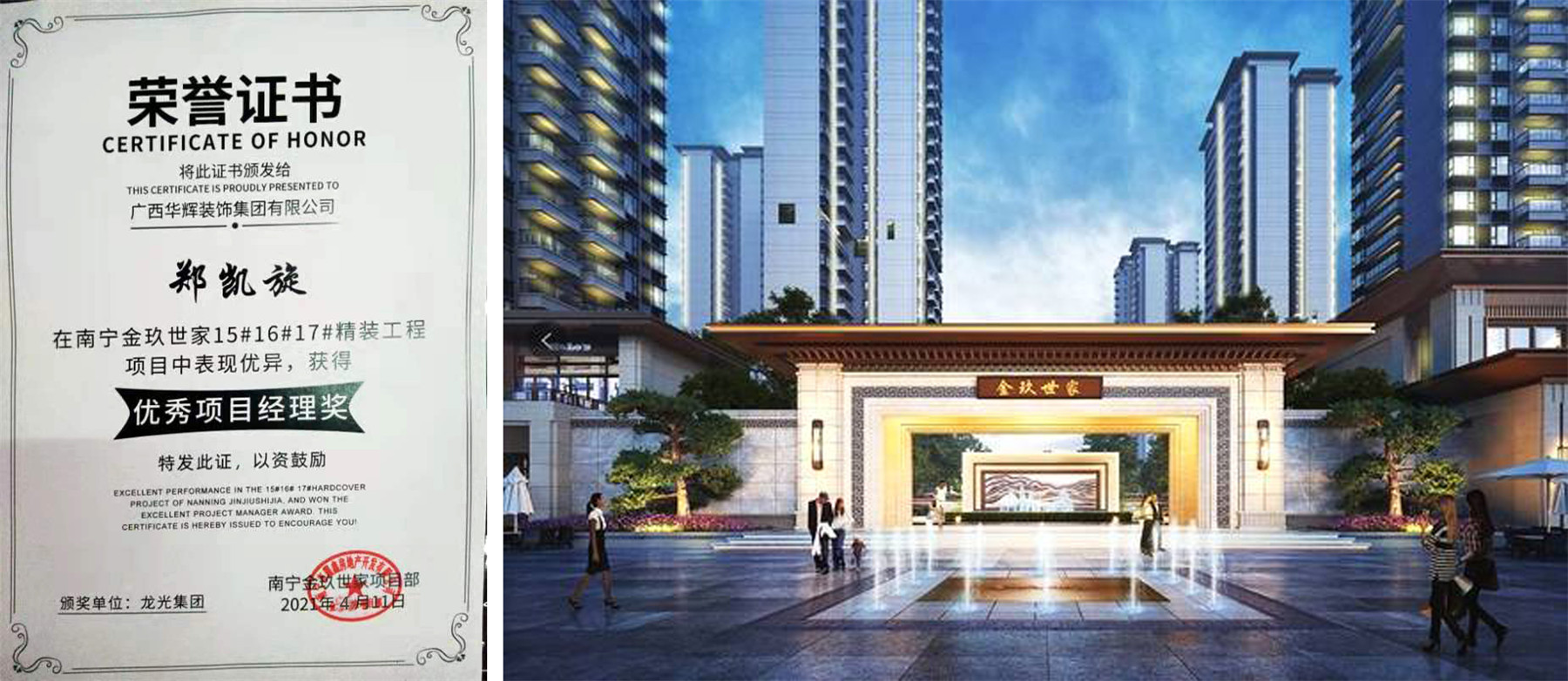 華輝承接的龍光金玖世家項(xiàng)目在工程質(zhì)量、安全文明、工程進(jìn)度等各方面表現(xiàn)優(yōu)異,獲得龍光集團(tuán)頒發(fā)的“優(yōu)秀項(xiàng)目經(jīng)理”獎(jiǎng)項(xiàng)。