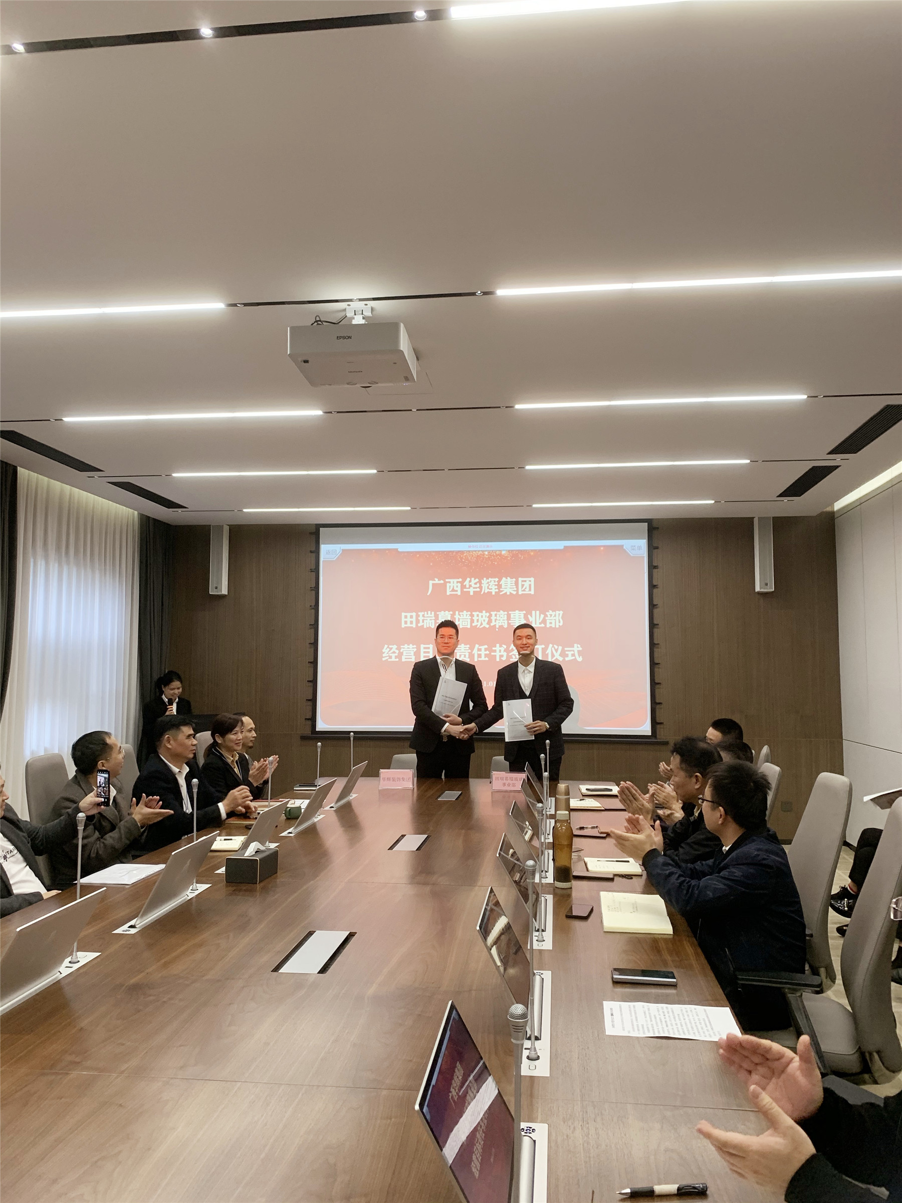 2021年11月1日,廣西華輝裝飾集團(tuán)有限公司與南寧田瑞玻璃有限責(zé)任公司,正式成立“華輝集團(tuán)田瑞玻璃幕墻事業(yè)部”,雙方簽署經(jīng)營(yíng)目標(biāo)責(zé)任書,開(kāi)啟全新領(lǐng)域的拓展。